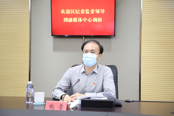 在区融媒体中心会议室,鲍雷一行听取了该中心疫情防控和两会服务保障工作汇报。
