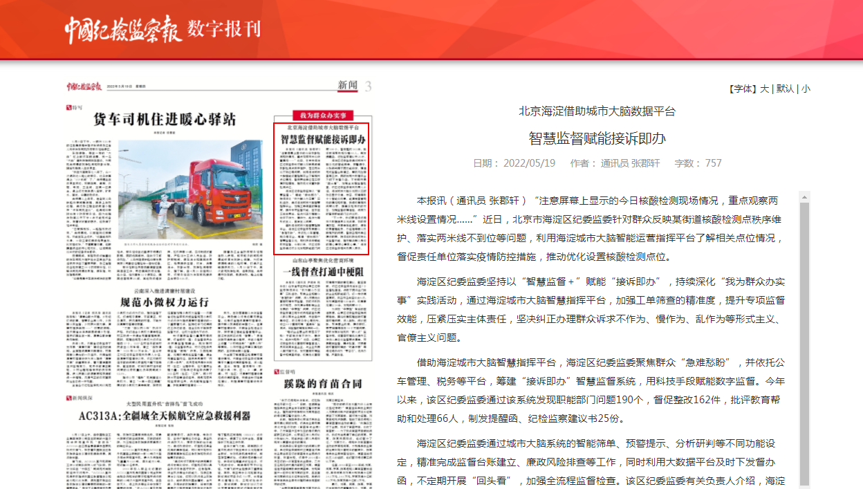 借助海淀城市大脑智慧指挥平台,海淀区纪委监委聚焦群众“急难愁盼”,并依托公车管理、税务等平台,筹建“接诉即办”智慧监督系统,用科技手段赋能数字监督。今年以来,该区纪委监委通过该系统发现职能部门问题190个,督促整改162件,批评教育帮助和处理66人,制发提醒函、纪检监察建议书25份。