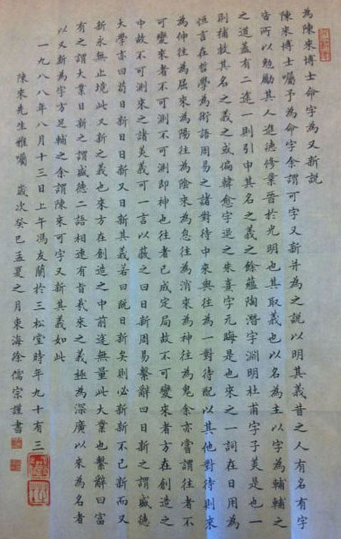 冯友兰:《为陈来博士命字为又新说》 徐儒宗书