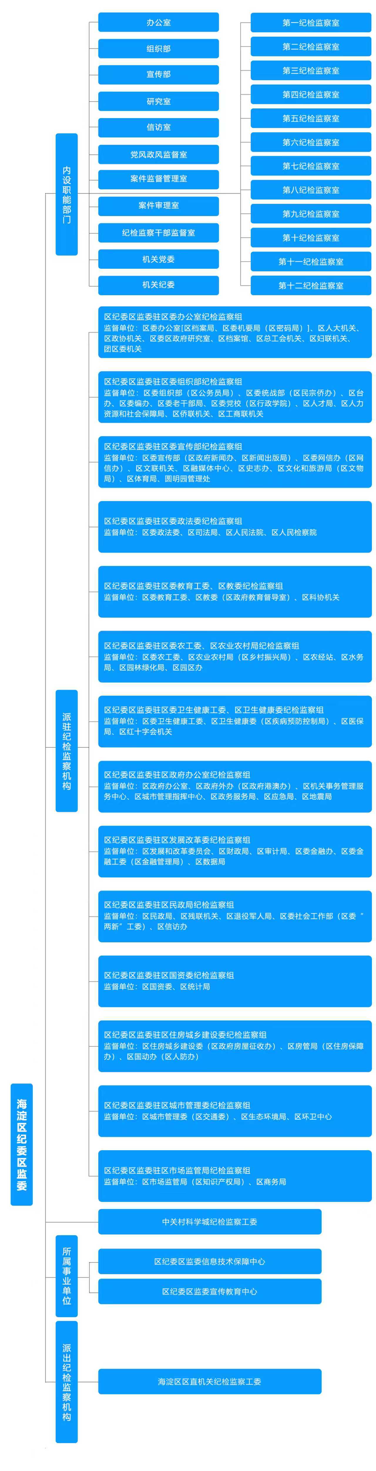中共北京市海淀区纪律检查委员会与北京市海淀区监察委员会合署办公,一套工作机构、两个机关名称,内设机构是:办公室、组织部、宣传部、研究室、信访室、党风政风监督室、案件监督管理室、第一纪检监察室、第二纪检监察室、第三纪检监察室、第四纪检监察室、第五纪检监察室、第六纪检监察室、第七纪检监察室、第八纪检监察室、第九纪检监察室、第十纪检监察室、第十一纪检监察室、第十二纪检监察室、案件审理室、纪检监察干部监督室。机关设机关党委和机关纪委,下设五个党支部。