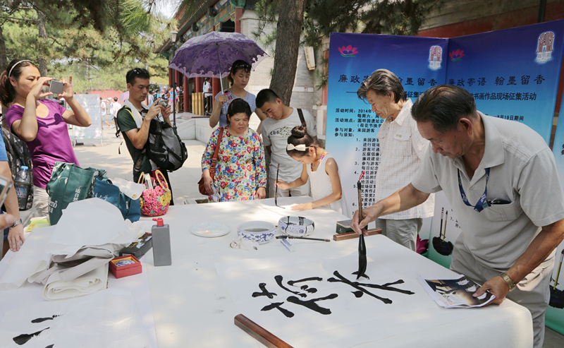 近日,圆明园第十九届荷花节迎来大批游人泛舟赏荷、消暑纳凉,在公园南门院内广场的西侧,一个现场题诗作画的展台吸引了不少人的注意。“廉政寄语 翰墨留香”,这是海淀区纪委、圆明园管理处于近期联合举办的廉政书画作品现场征集活动,该活动旨在推动海淀区廉政文化建设工作,面向全社会弘扬风清气正的良好风尚。