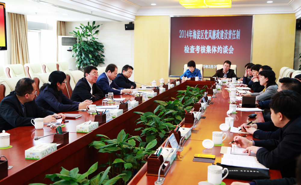 3月30日下午,海淀区召开2014年党风廉政建设责任制检查考核集体约谈会。区委书记隋振江,区委常委、区纪委书记芦育珠,副区长龚宗元和考核排名靠后的苏家坨镇、西北旺镇、温泉镇、上庄镇及北太平庄街道党政主要领导、纪工委书记参加了会议。会议由区委常委、区委办主任李彦来主持。